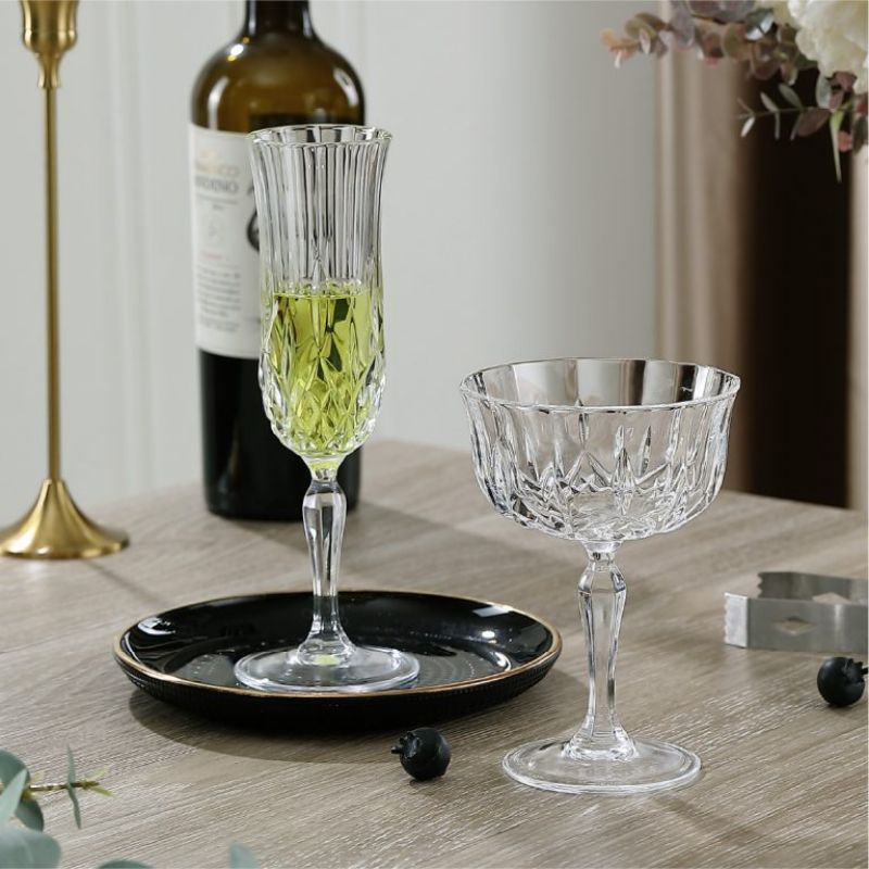 This 240ml crystal coupe goblet features a wide 100mm bowl with vertical and leaf‑style cut patterns that create a sparkling, light‑reflecting effect.The coupe shape is perfect for cocktails, champagne, sparkling drinks, desserts, and signature beverages served at weddings and special events.Made from lead‑free crystal glass, the goblet ensures safety, clarity, and durability. Its short stem and reinforced base provide stability during high‑traffic event service.Each set of 6 is packaged in export‑safe cartons, with optional custom gift boxes for retail and private‑label programs.