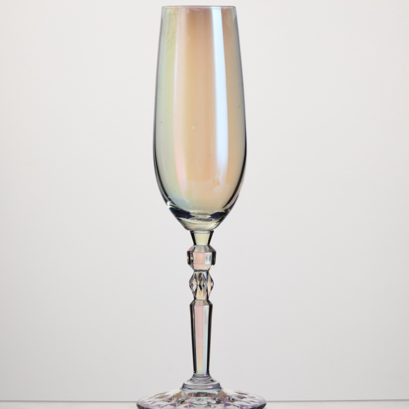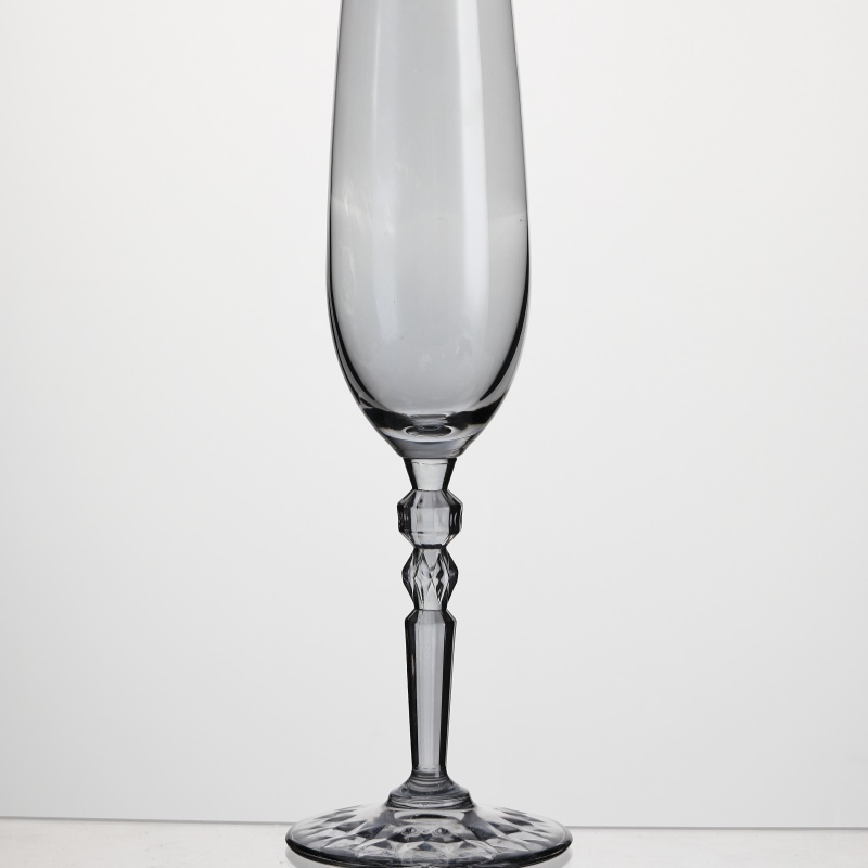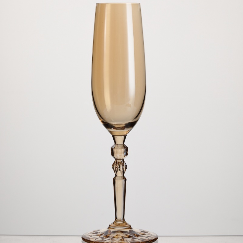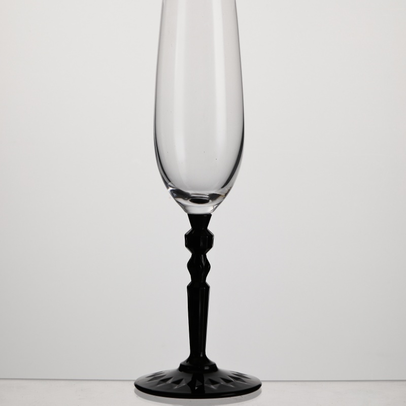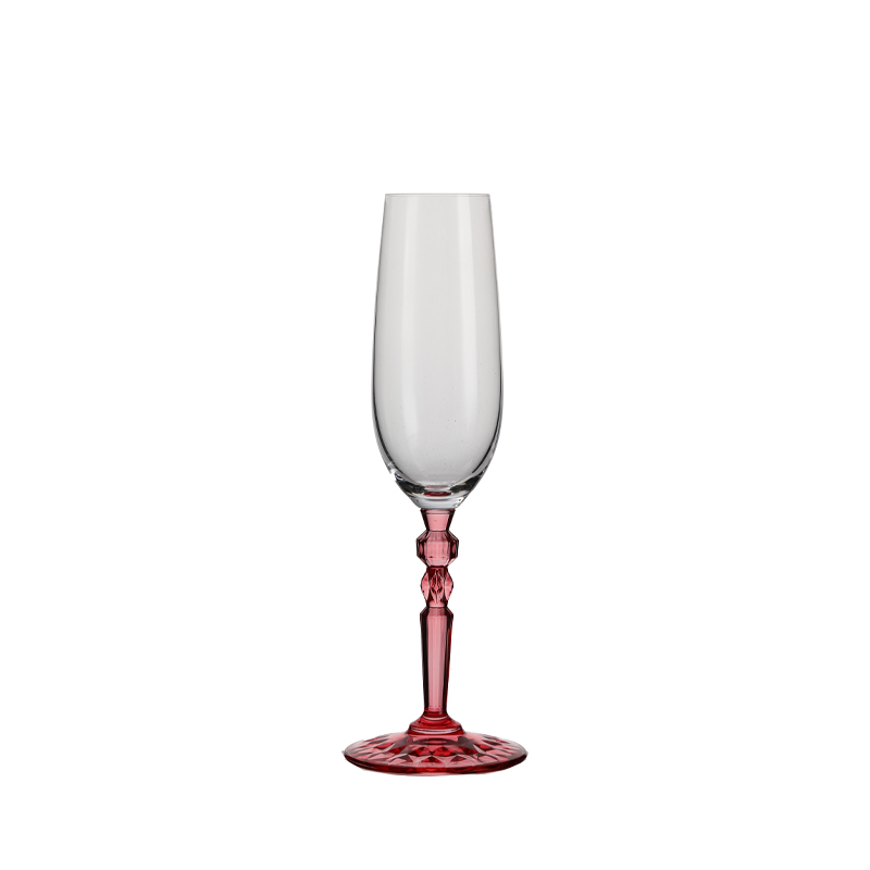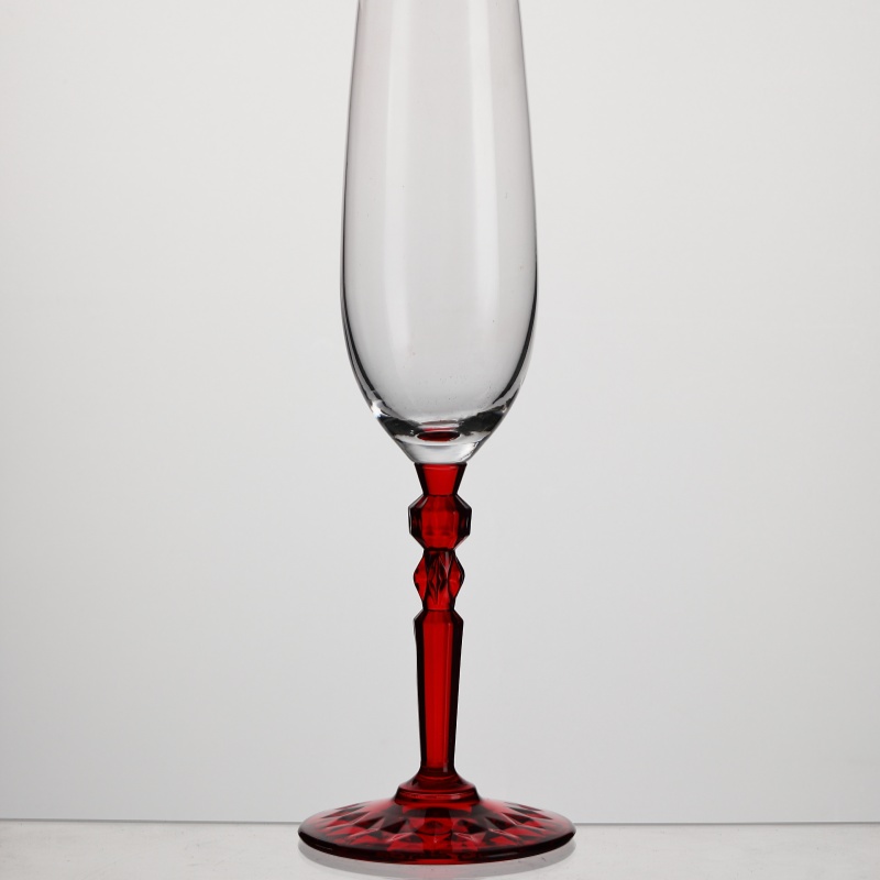 This XHS61CP25C crystal champagne glass, with a 250ml capacity, features a clear, transparent body, a slender and elegant design, and a striking red, multifaceted stem, presenting a sophisticated visual appeal. Designed specifically for champagne, prosecco, cava, and sparkling cocktails, its slender body helps retain the bubbles, while the weighted base ensures stability during drinking. This champagne glass is the ideal choice for hotels, restaurants, banquet halls, wedding planners, and global distributors seeking high-end glassware.