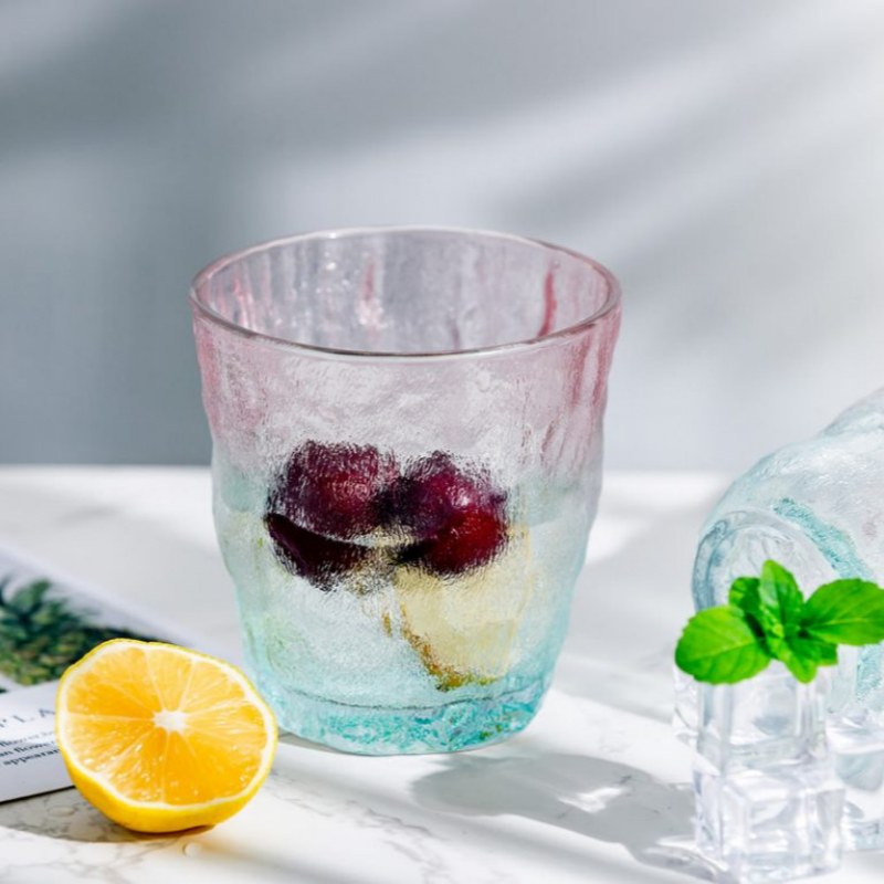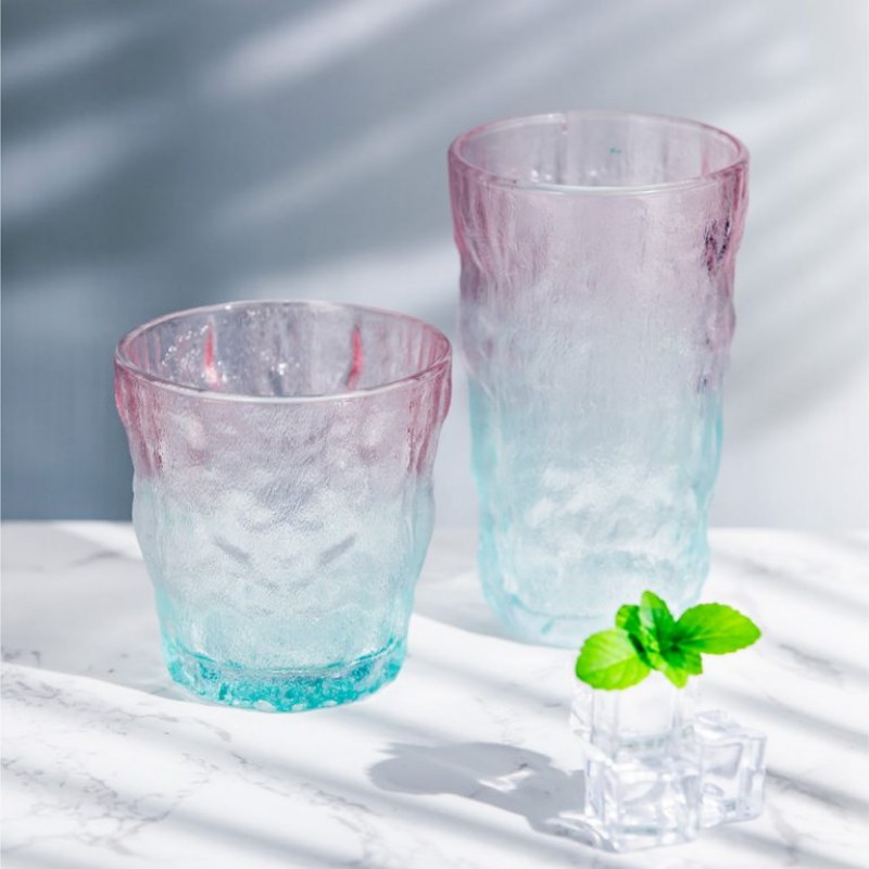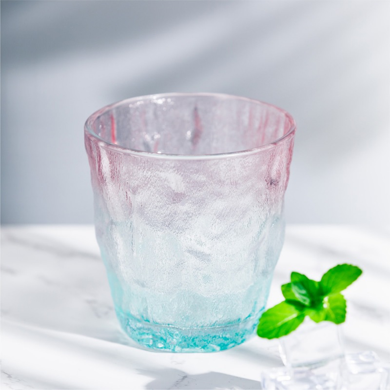 A gradient textured glass tumbler is a type of soda‑lime drinkware featuring a multi‑color finish and a tactile surface that enhances grip and visual appeal. The XHKB047B model offers a 260ml (8.8 oz) capacity, a pink‑to‑blue gradient, and a wavy textured body, making it suitable for whiskey, cocktails, juice, and everyday beverage service. This tumbler is widely used in cafés, restaurants, bars, boutique hotels, and home lifestyle settings.