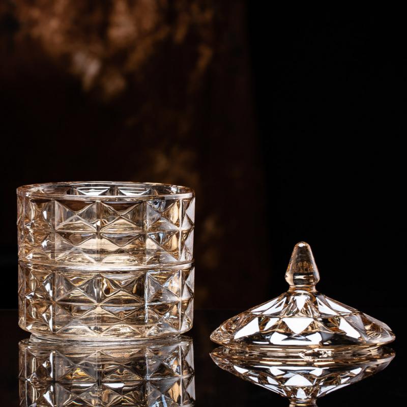 Add a touch of luxury to your space with this amber glass candy jar set. The intricate diamond-cut design and plated lid evoke vintage charm while offering modern elegance. Perfect for home decoration, boutique gifting, or seasonal displays, these glass containers shine with a warm amber glow. Their sculptural silhouette transforms them from simple storage jars into standout pieces for interior styling and curated displays.
