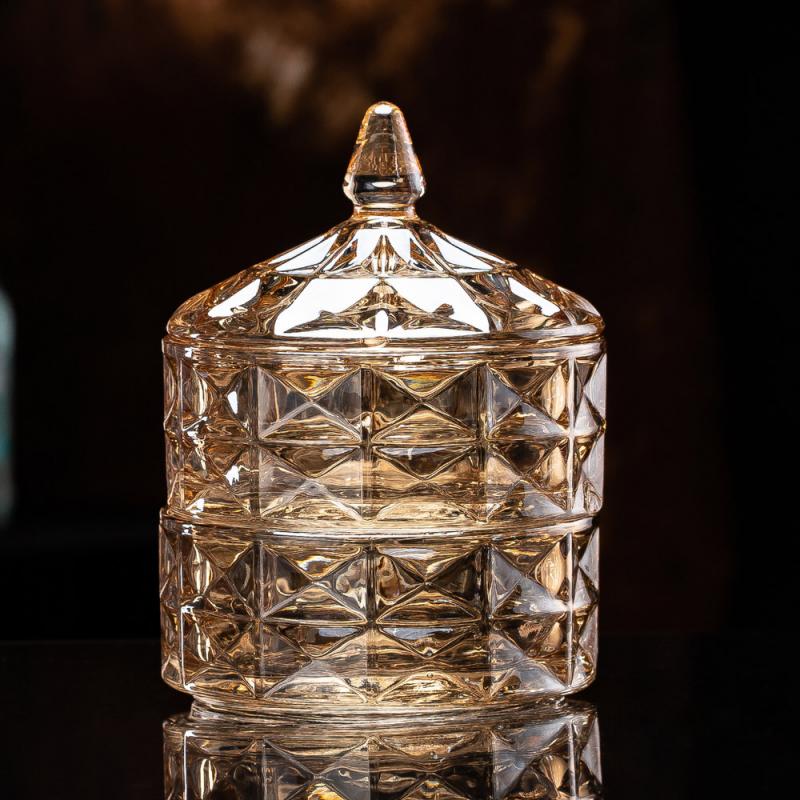 Made from soda lime glass with a plated finish, the XHDSTG1055DL amber glass candy jar set delivers a premium solution for decorative storage. Each jar features a diamond-cut texture and a matching lid with finial, combining elegance and function. Ideal for candy buffets, hotel displays, or retail decoration, this 2-piece glass jar set enhances interiors with its amber hue and timeless form. Suitable for storing candy, jewelry, or small accessories.
