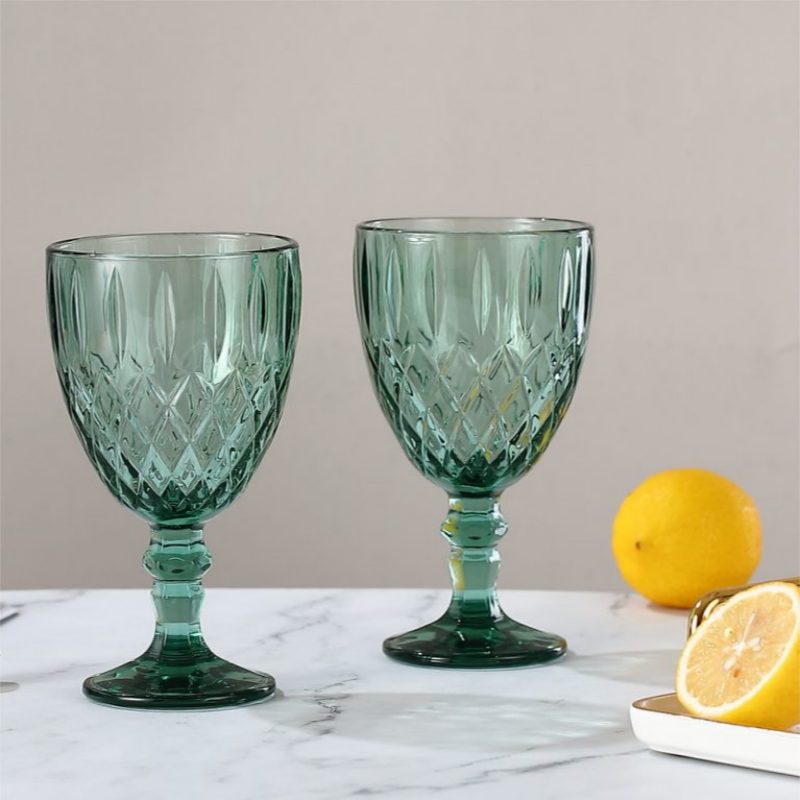 Elevate your tableware collection with this vintage-inspired green glass goblet, crafted from thick, durable glass for long-lasting use in high-volume settings. The diamond-textured surface not only enhances grip but also reflects light beautifully, creating a refined presentation for wine, cocktails, or specialty beverages. Designed with a short stem and wide base for stability, this goblet is ideal for restaurants, hotels, catering services, and event planners seeking reliable yet stylish drinkware. Available in bulk wholesale supply and customizable for OEM projects, it offers both practicality and timeless elegance for professional buyers.