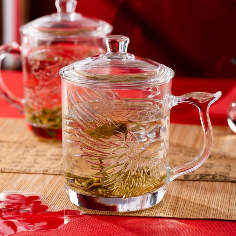 Clear Glass Tea Mug with Lid – 425ml Artistic Wing Pattern, Bulk Supply for Hospitality