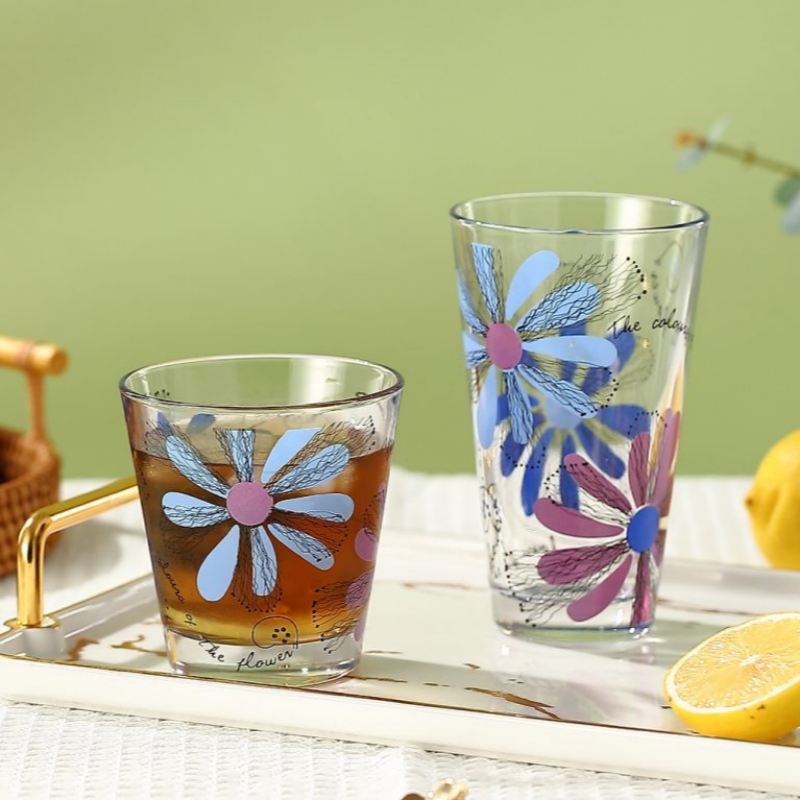 Add a touch of charm to your drinkware collection with this floral printed soda lime glass tumbler set. Each cup features whimsical artwork that enhances the dining experience, making it perfect for boutique cafés, lifestyle hotels, or event planners. Sized between 101–300 ml, these tumblers are ideal for water, juice, or cocktails. Lightweight, dishwasher-safe, and available for wholesale customization, they offer a blend of beauty and practicality for brands that value design-driven presentation.