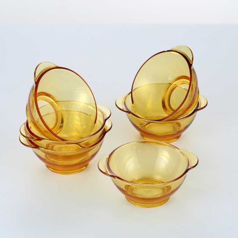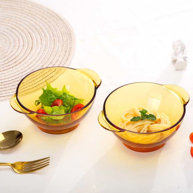 This set of amber glass bowls is crafted from premium heat-resistant borosilicate glass, ensuring durability, safety, and long-lasting performance. Each bowl features dual side handles for easy serving and handling, while the stackable design saves storage space in professional kitchens. The warm amber color adds a vintage yet elegant touch, making it suitable for restaurants, hotels, catering services, and supermarkets.