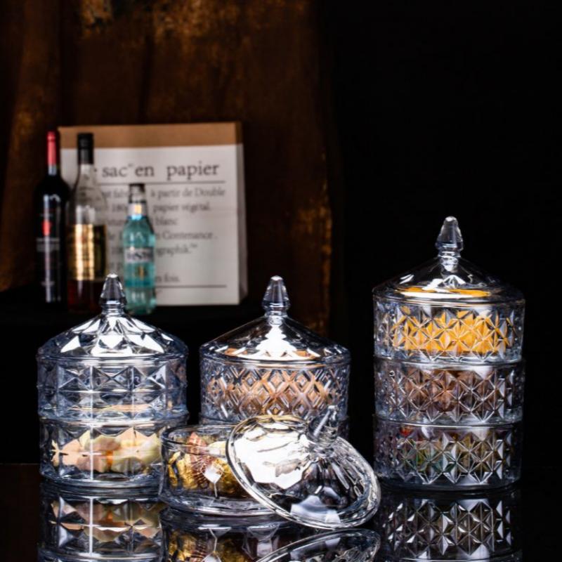 The XHDSTG1055AL stacking amber glass candy jar set is crafted from durable soda lime glass with a refined plated finish, offering both elegance and utility. Featuring three stackable tiers, each with a diamond-cut texture and a matching lid with finial, this set is ideal for candy buffets, hotel amenities, and retail displays. Its compact vertical design maximizes space while showcasing sweets, dry fruits, or small accessories in a visually appealing way.