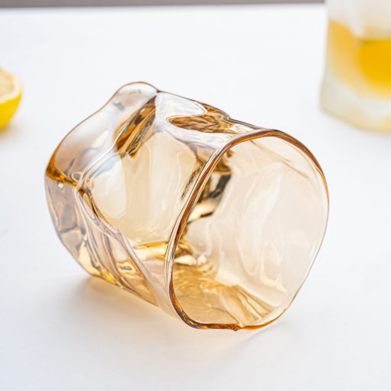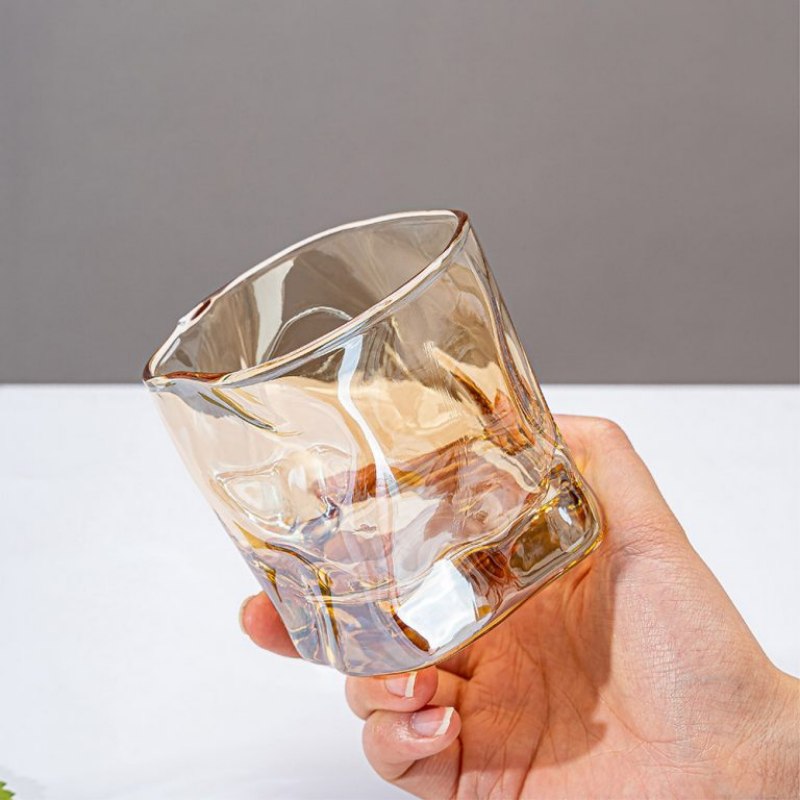 Designed for premium hospitality and lifestyle brands, this handmade amber glass tumbler features a unique irregular shape and textured surface that elevates any beverage presentation. Ideal for whiskey, cocktails, or iced drinks, it’s crafted from durable borosilicate glass and available for OEM customization. Perfect for upscale bars, hotels, and giftware distributors seeking distinctive drinkware.