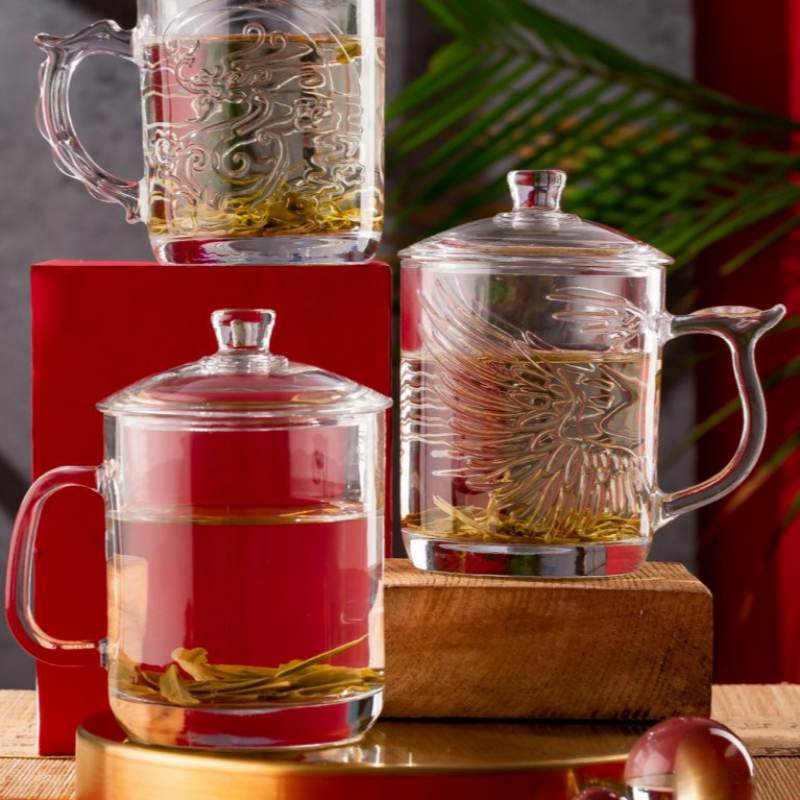 Inspired by traditional symbolism, this 425ml lidded glass mug brings the legendary dragon and phoenix to life through exquisite embossed detailing. The high‑white soda lime glass captures the warm glow of tea, creating a serene and ceremonial drinking experience. Paired with a matching lid and a gracefully curved handle, the mug blends artistry with everyday comfort—perfect for elevating tea rituals, gifting occasions, or premium hospitality settings.