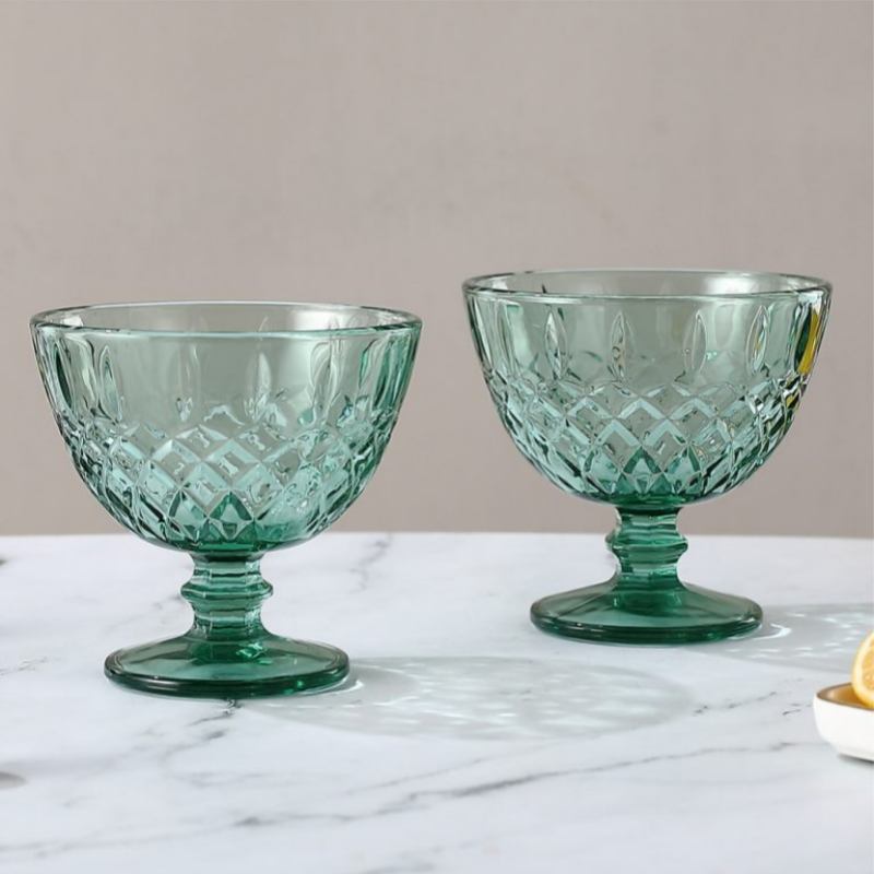 Serve elegance with every dessert using our vintage-style green glass bowls. Featuring a diamond-cut lower half and oval-textured upper rim, this pedestal bowl combines retro charm with modern durability. Made from thick pressed glass, it’s ideal for serving ice cream, fruit, or puddings in restaurants, hotels, and event venues. Available for bulk orders and OEM branding, this piece is perfect for distributors seeking stylish, functional tableware with timeless appeal.