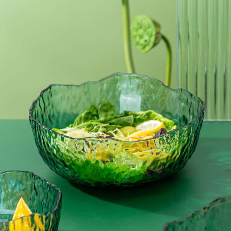 This green hammered glass salad bowl blends artisanal craftsmanship with modern dining aesthetics. Its scalloped rim and dimpled texture catch the light beautifully, creating a vibrant centerpiece for salads, fruits, or decorative displays. Beyond functionality, it conveys a sense of freshness and sophistication—perfect for brands, retailers, and hospitality businesses seeking to enrich their product line with unique, story‑driven glassware. With customizable options and wholesale availability, it’s more than a serving bowl—it’s a statement of style.