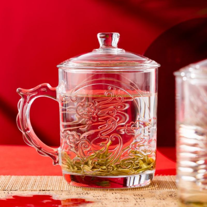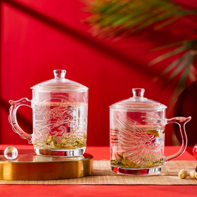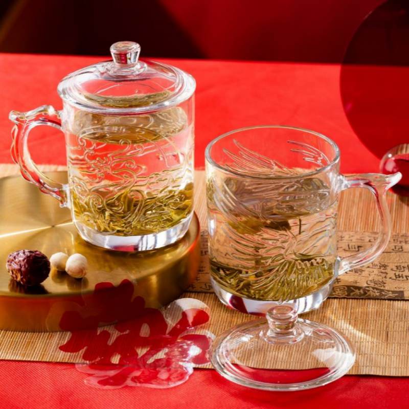 This 425ml glass mug with lid is crafted from high-white soda lime glass, offering excellent clarity and durability for daily beverage service. Featuring embossed dragon and phoenix motifs, the mug combines cultural elegance with commercial-grade strength. The ergonomic handle and fitted lid enhance heat retention and hygiene, making it ideal for tea, coffee, and herbal infusions.