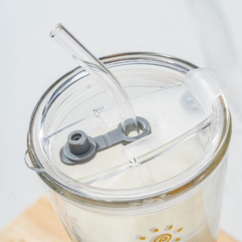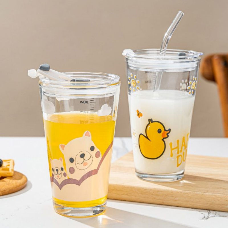 The cup features a cheerful printed pattern that enhances the visual appeal of everyday drinks. Its clear glass body highlights beverage color and texture, making it suitable for aesthetic drink presentation, juice serving, and iced tea glassware in cafés or home settings. The playful design appeals to younger consumers and lifestyle‑oriented retail displays.