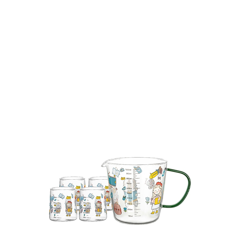 This 5‑piece borosilicate measuring cup set includes a 500ml measuring cup with handle and four 320ml printed tumblers, designed for commercial kitchens, cafés, bakeries, and food‑service operations. Made from high‑temperature borosilicate glass, the set offers excellent durability and thermal shock resistance for both hot and cold liquids. The printed measurement scale ensures accurate portioning, while the decorative prints enhance product differentiation for retail and promotional programs. Ideal for bulk procurement, this set supports OEM/ODM customization, including custom decals, logo printing, and private‑label packaging, making it suitable for distributors, kitchenware brands, and hospitality suppliers.