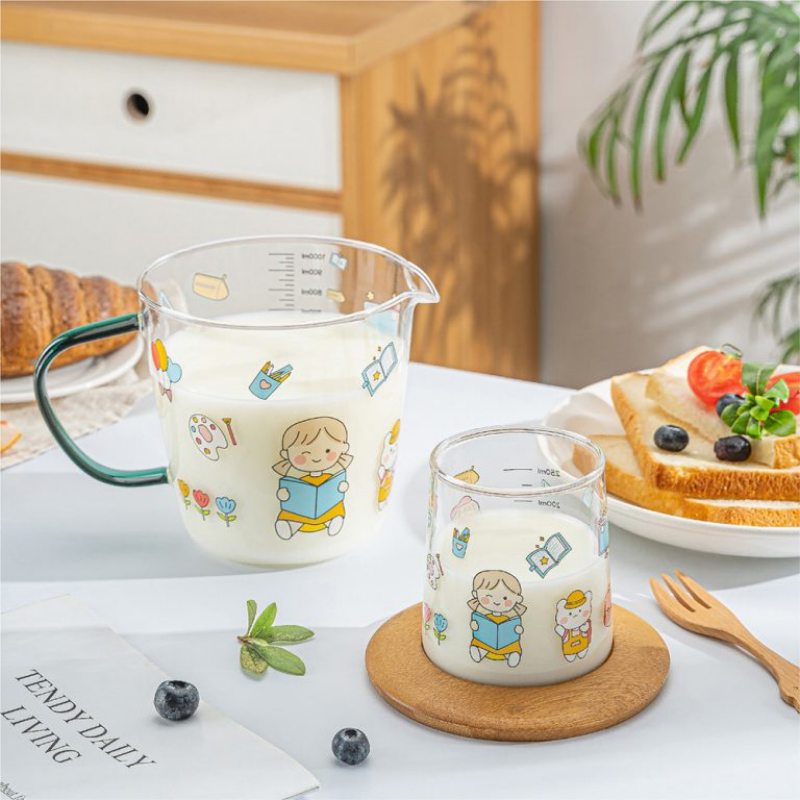 This charming 5‑piece borosilicate glass measuring cup set blends functionality with playful design. The 500ml measuring cup features clear printed markings for precise measurement, while the four 320ml tumblers showcase colorful, decorative artwork that adds personality to any kitchen. Crafted from durable borosilicate glass, the set is heat‑resistant, easy to clean, and ideal for everyday cooking, baking, and beverage serving.