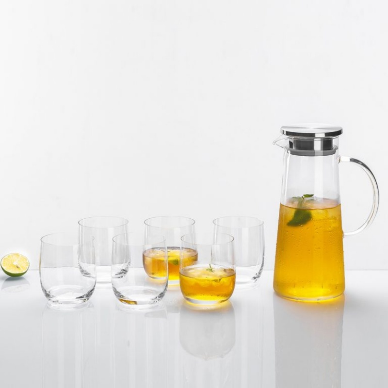 Elevate your tableware with this minimalist Glass Pitcher and Tumbler Set, crafted from crystal-clear borosilicate glass and topped with a S304 stainless steel lid. The 1450ml pitcher and six 280ml tumblers blend modern aesthetics with practical function, perfect for serving cold brew, fruit water, or herbal tea. Its refined silhouette, heat resistance, and stackable structure make it a versatile choice for lifestyle brands, homeware collections, and premium gifting.