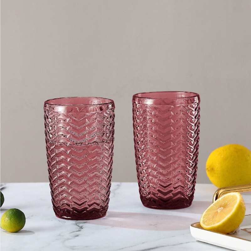 This pink chevron glass tumbler, wave-patterned glass adds a touch of elegance to your tableware collection. Crafted from premium colored glass, it combines modern design with durable quality. The wave pattern not only adds a stylish touch but also ensures a comfortable grip for everyday use. Whether you're creating a bespoke style for your restaurant or providing unique glassware for retail customers, this glass offers both practicality and exquisite beauty.