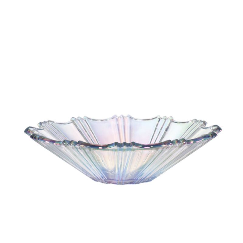 The XHDSW2047W Plated Glass Fruit Plate features a 323mm top diameter, 87mm height, and a fluted, scalloped design. Its plated finish enhances visual appeal, making it suitable for kitchenware collections, hotel buffet setups, restaurant tabletops, and retail displays. The heavy 1820g construction ensures durability and stability in both home and commercial environments.