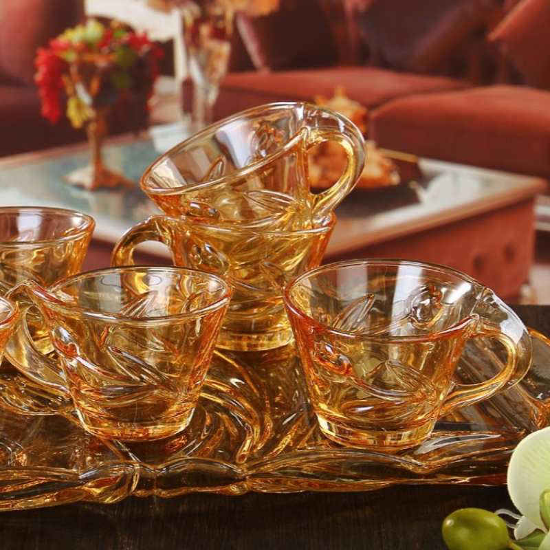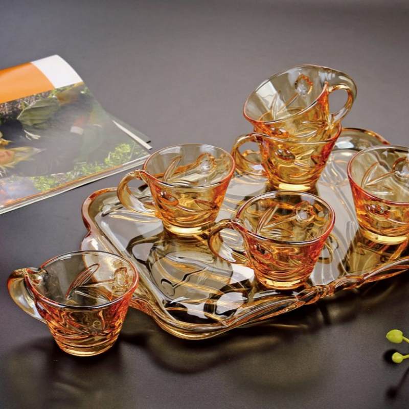 The XHDS2031‑L7HA Tea & Coffee Set includes six 130ml embossed soda lime glass cups and a matching decorative tray. The amber color, floral‑pattern embossing, and scalloped tray design create a vintage, elegant aesthetic ideal for tea service, coffee tasting, home décor, and hospitality settings. This set is perfect for homeware brands, cafés, tea houses, hotels, and gift‑set programs. Standard packaging is 1×7×6, optimized for wholesale distribution.